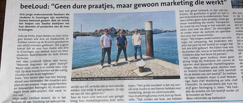 Onlangs stonden wij met beeLoud in de Texelse Courant. Een mooi moment voor ons als jong Texels marketingbureau en een bevestiging dat onze manier van werken wordt gezien en gewaardeerd op het eiland.